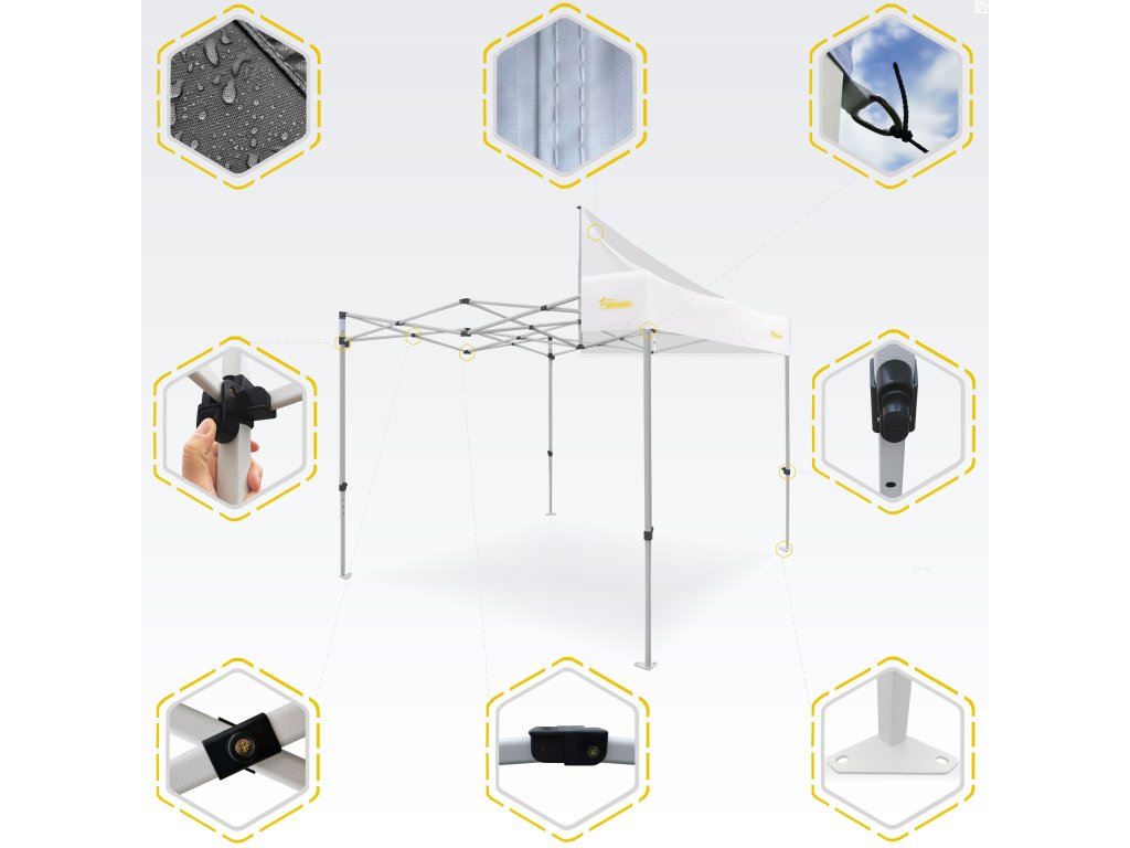 Diese robusten Stützen gewährleisten, dass das Zelt auf jeder Oberfläche stabil und zuverlässig ist,
